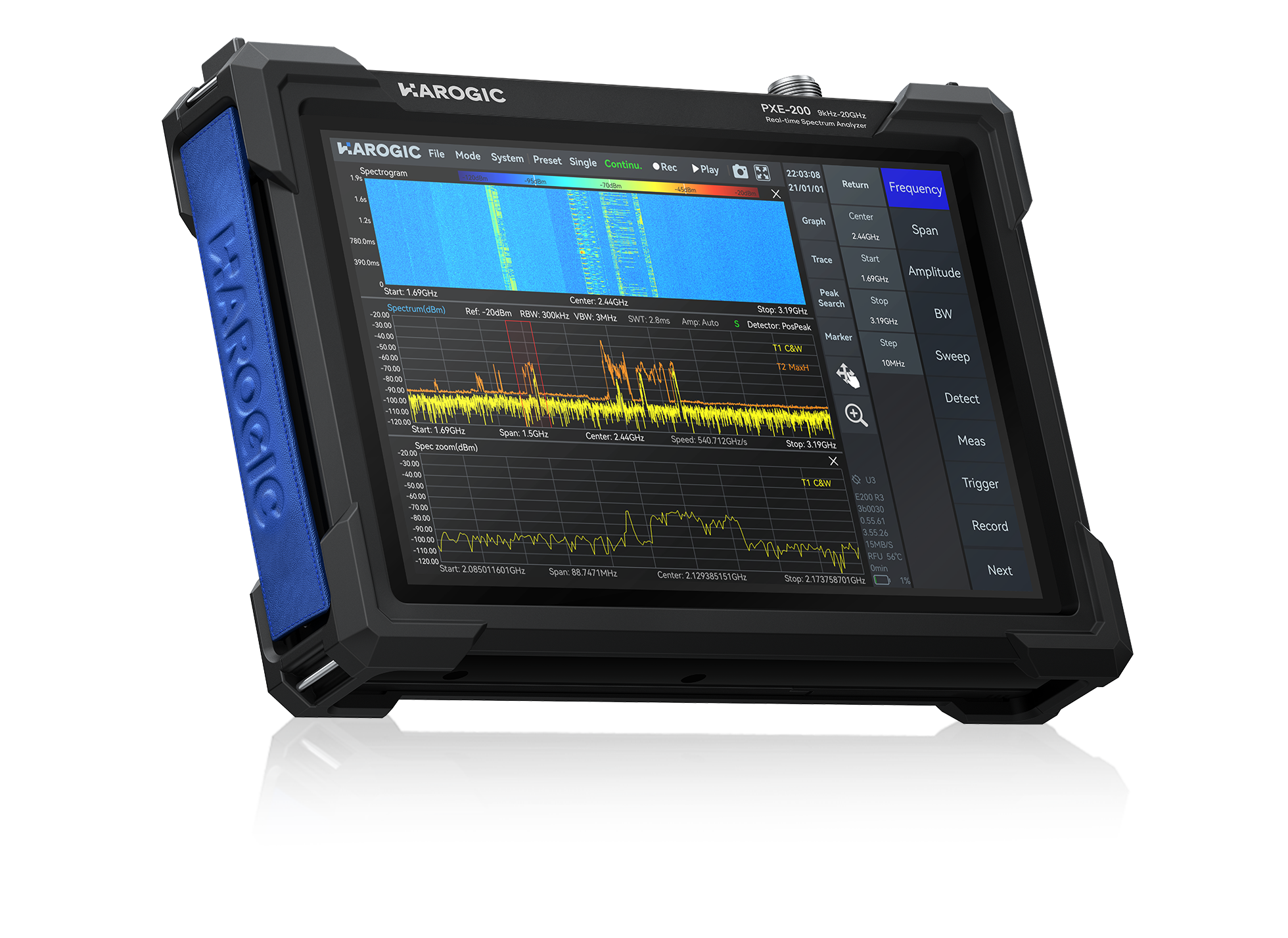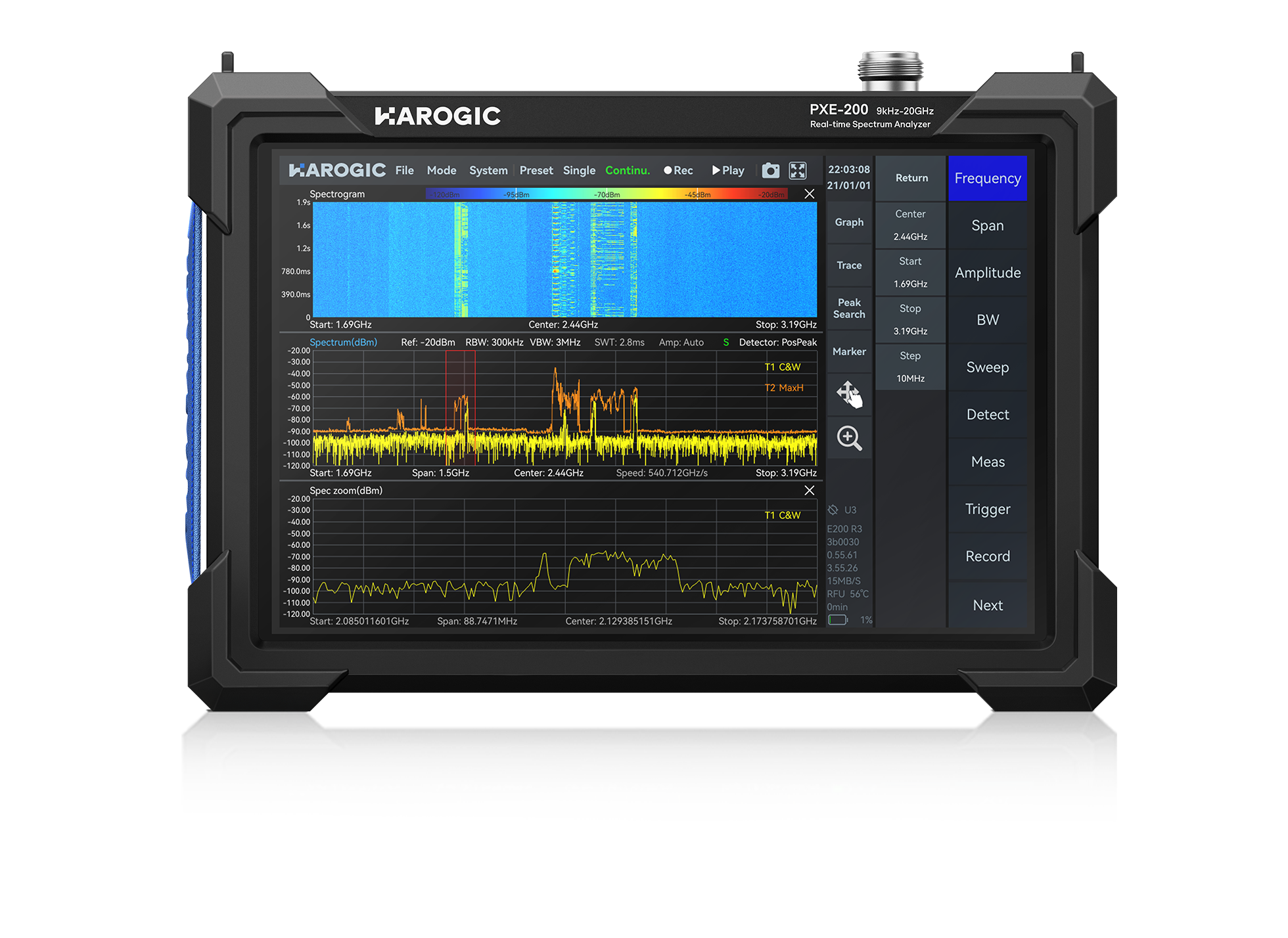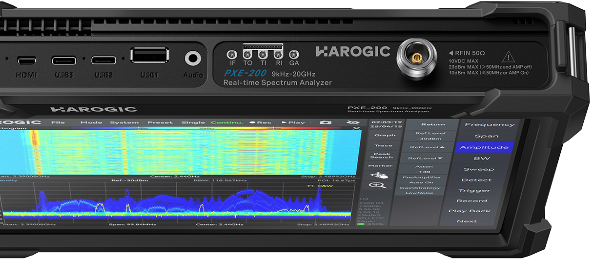 PXE series is the real-time spectrum analyzer up to 20 GHz with analytical bandwidth of 100 MHz and ultra-fast speed of 900 GHz/s, delivering standard spectrum sweep (SWP), IQ streaming (IQS), zero span (DET) and real-time analysis (RTA) working mode. The PXE-200 achieves good dynamic range and phase noise level. It can provide customers with spectrum analyzer, spectrum monitoring, interference finding, RF test and measurement functions.
