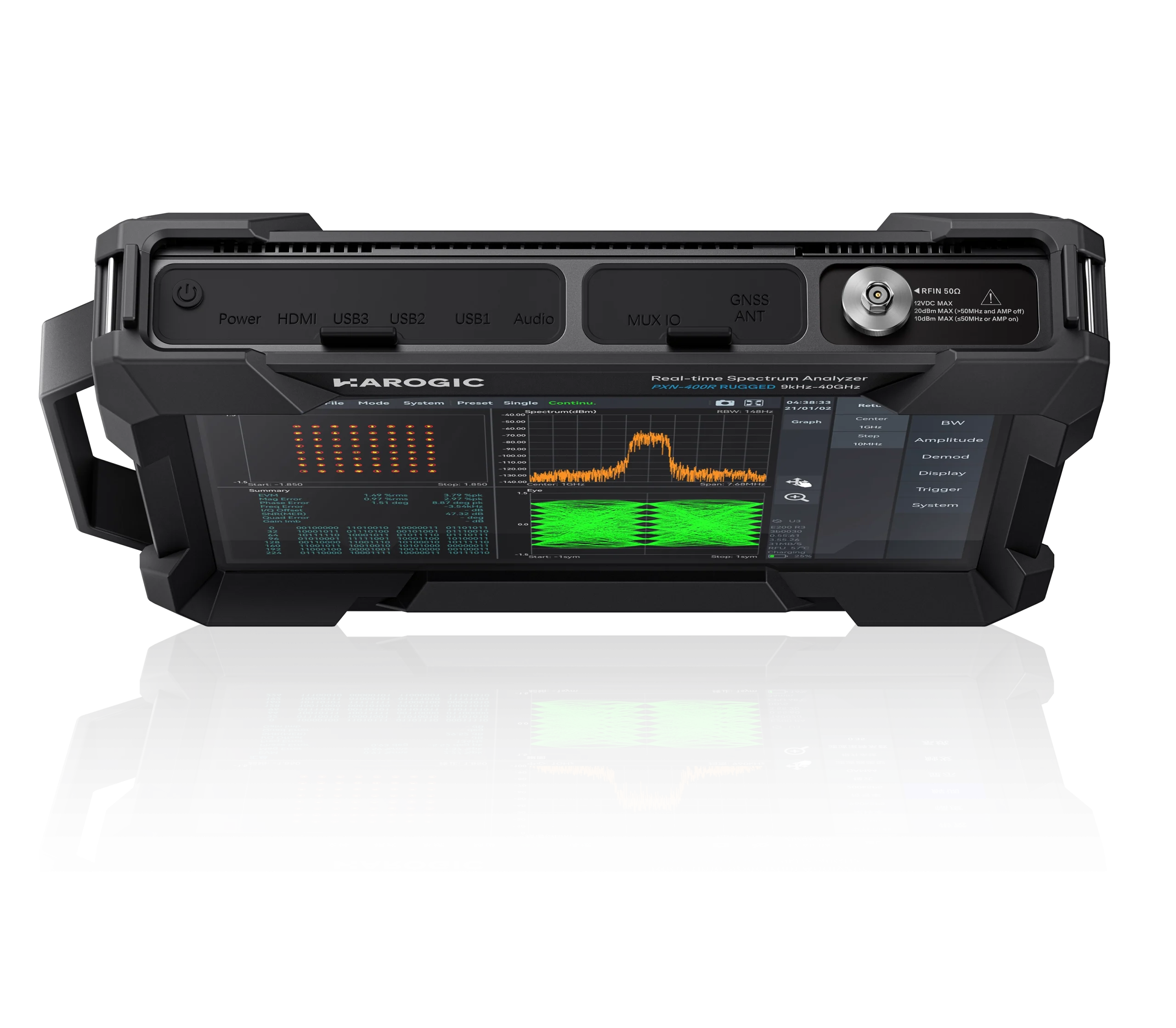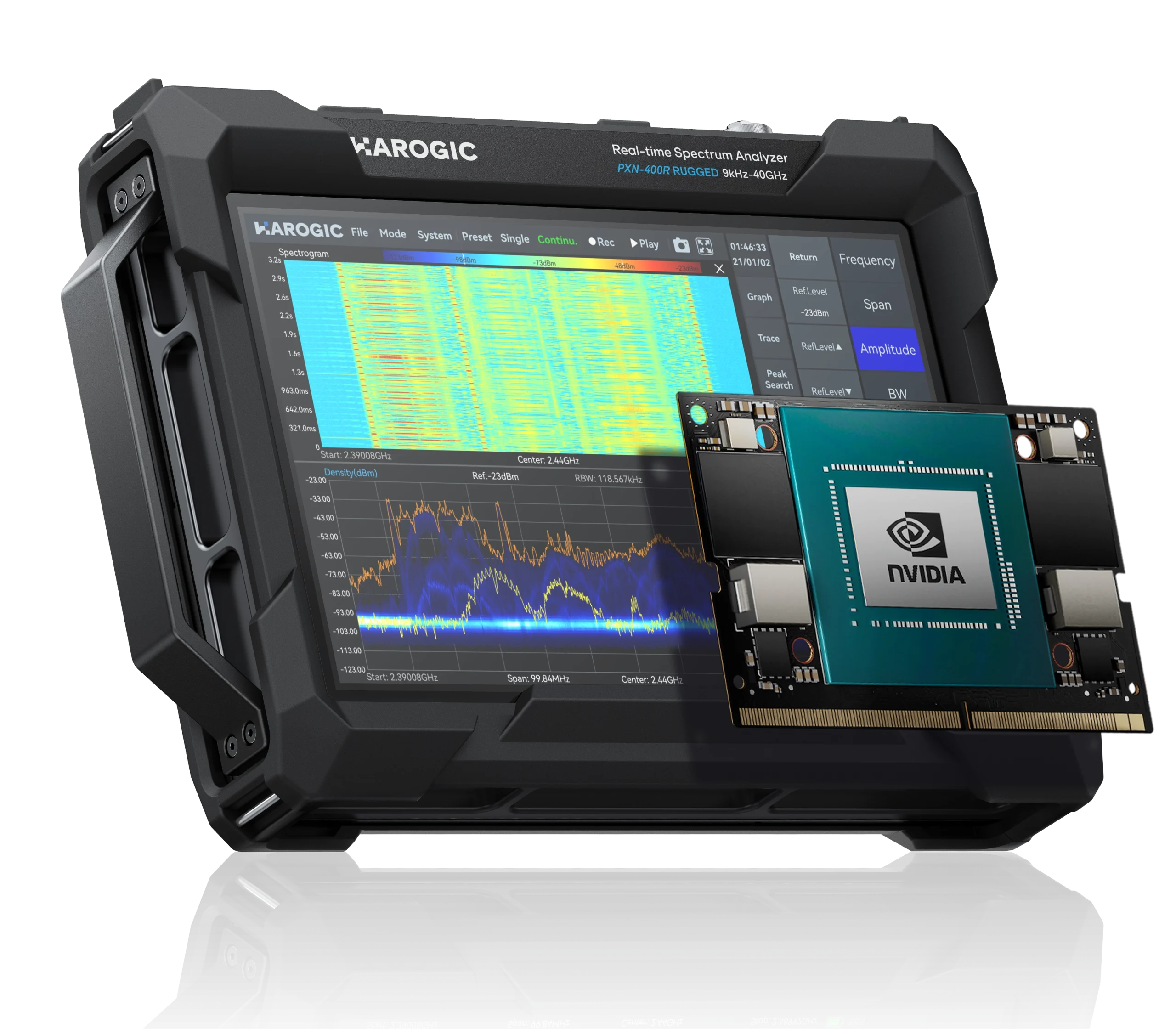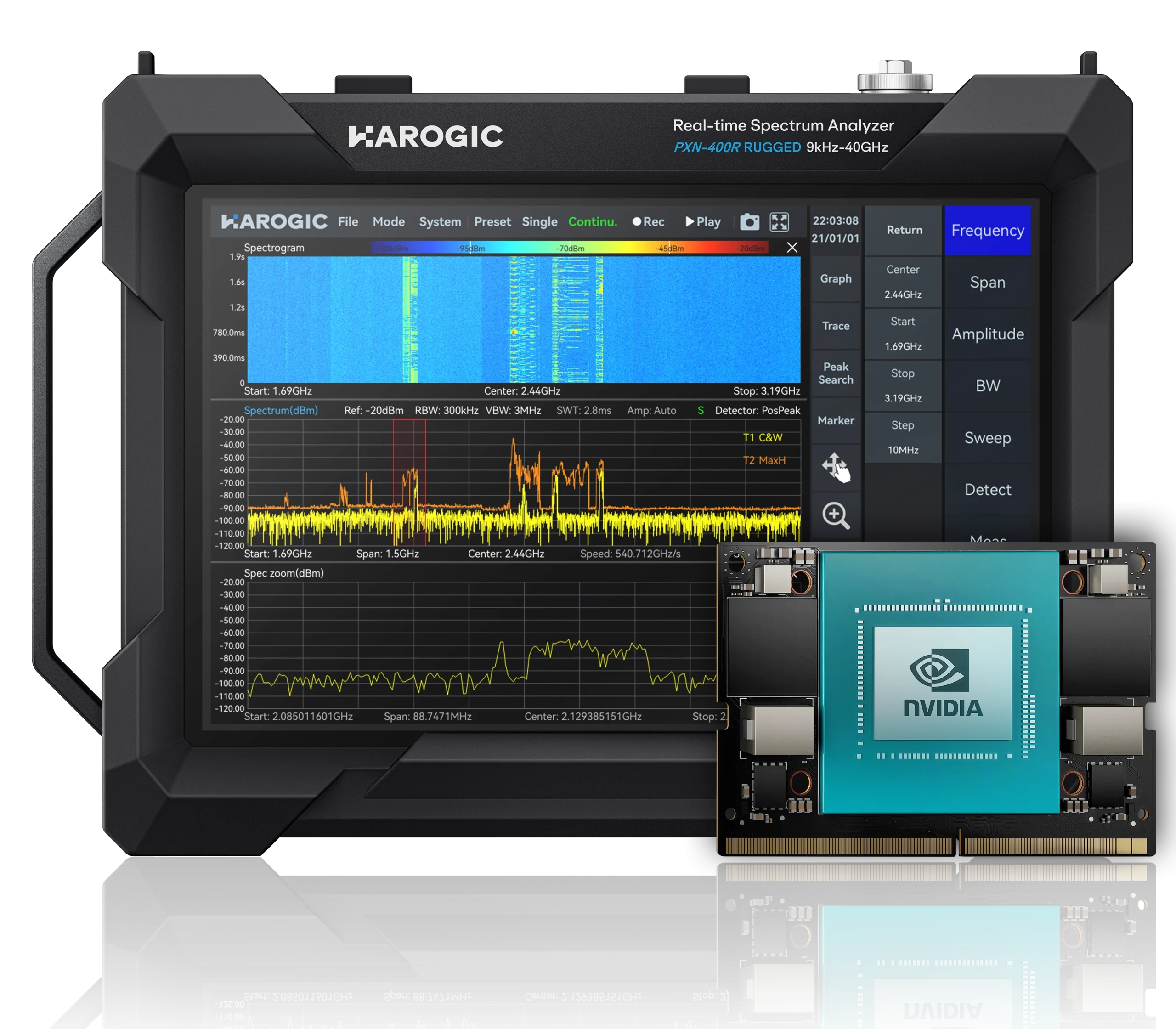 HAROGIC PXR series spectrum analyzer is designed for durabilit with an IP68 rating. It offers a 100 MHz analysis bandwidth as standard and supports frequencies from 9 kHz to 9.5/20/40 GHz, with a sweep speed surpassing 500 GHz/s. Additionally, the PXR series includes the Orin NX 8G option, providing up to 117 TOPS of AI computing power. The analyzer also features a highly compatiblet API, positioning it as an efficient AI-powered spectrum analysis platform for fast spectrum identification and analysis.